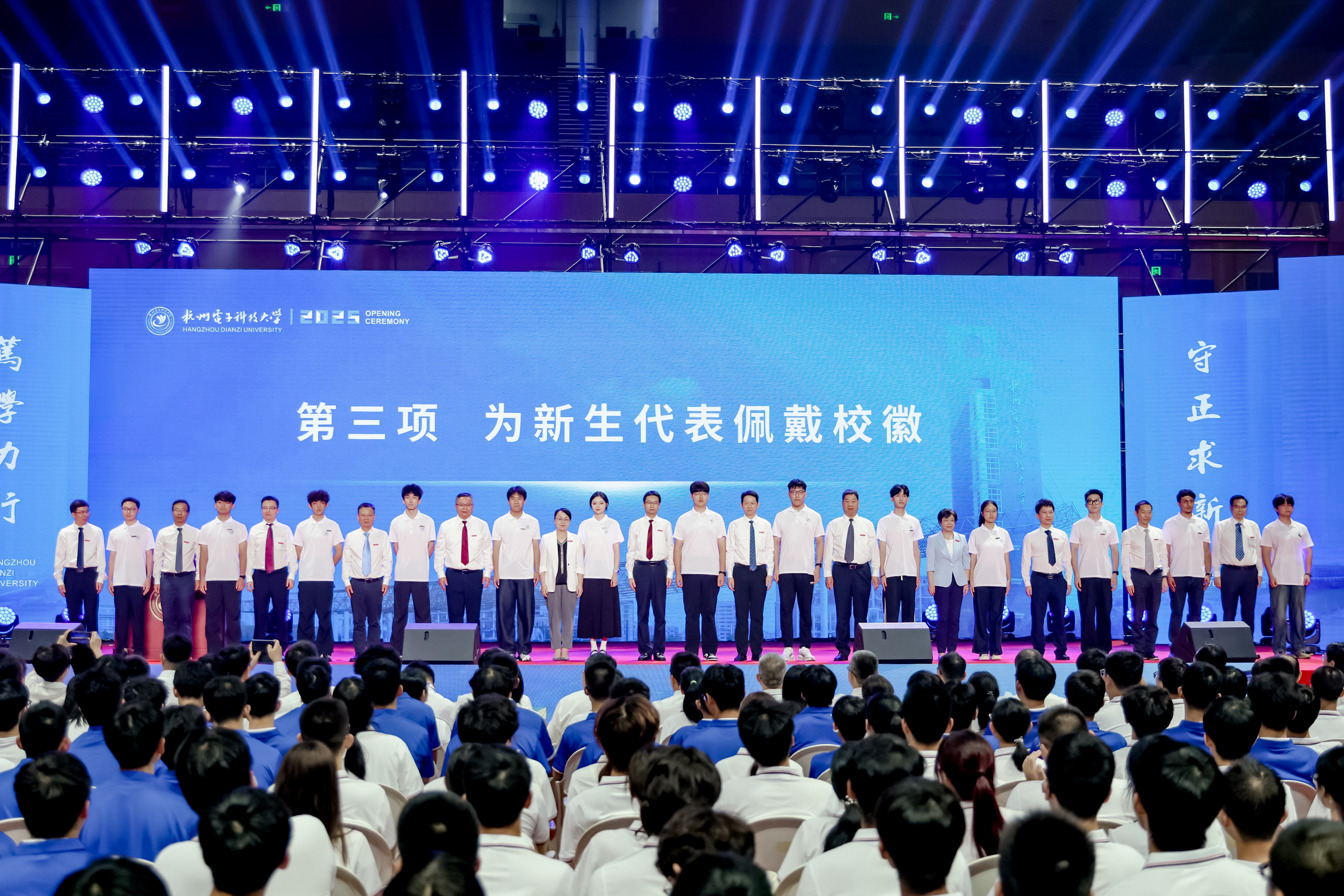 典礼在国歌声中正式拉开帷幕。校领导和嘉宾为新生代表佩戴校徽,象征校训“笃学力行、守正求新”的精神传承,新的杭电人正式汇入杭电的星河,共同肩负起“国家大事千万尽力”的光荣使命。承载69年荣光的校旗徐徐展开,全场齐唱校歌,一代代杭电人在信息技术、国防军工的浪潮中奋楫争先,驱动杭电这艘巨轮驶向更广阔的星辰大海。