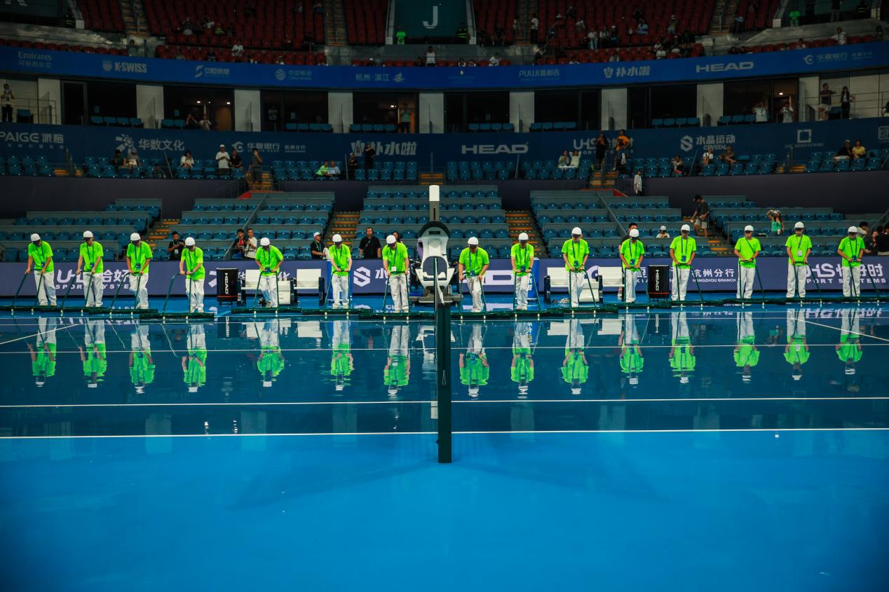168千米/时、192千米/时、224千米/时......球员每个挥拍的瞬间,速度都如同高铁穿梭在城市的脉络——场地服务领域的志愿也正是如此的分秒必争。烈日下的网球赛场上,他们挥汗如雨,为参赛球员准备降温冰毛巾和冰桶,随时补充网球。暴雨骤降时,“小青荷”们第一时间抓起拖把推车冲入场内,一道道荧光绿的忙碌身影穿梭在雨幕中与时间赛跑。在志愿者们争分夺秒地排水保畅后,赛场很快恢复了比赛状态,运动员们重返赛场。自动化学院2023级本科生金煜昕事后感慨道:“看着拖布划过之处留下一道干燥的痕迹,想到比赛就能尽快恢复,身上便又充满了力量。”